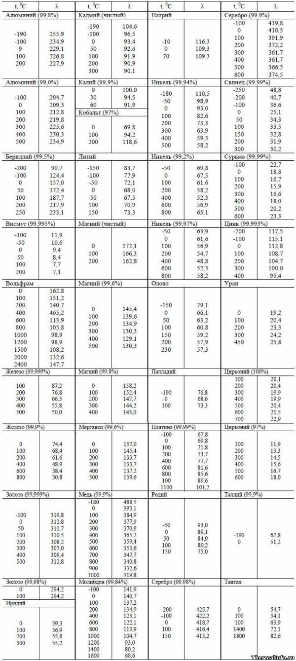Теплопроводность чистых металлов. Таблица теплопроводности металлов