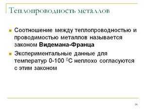 Теплопроводность металлов – это перенос тепла от более горячих частиц к более холодным по закону Фурье при их макроскопической неподвижности. Она зависит от структуры материала, его химического состава и типа межатомной связи. В металлах передача тепла производится электронами, в других твердых материалах – фононами. Теплопроводность металлов тем выше, чем более совершенную кристаллическую структуру они имеют. Чем больше металл имеет примесей, тем более искажена кристаллическая решетка, и тем ниже теплопроводность. Легирование вносит такие искажения в структуру металлов и понижает теплопроводность относительно основного металла.