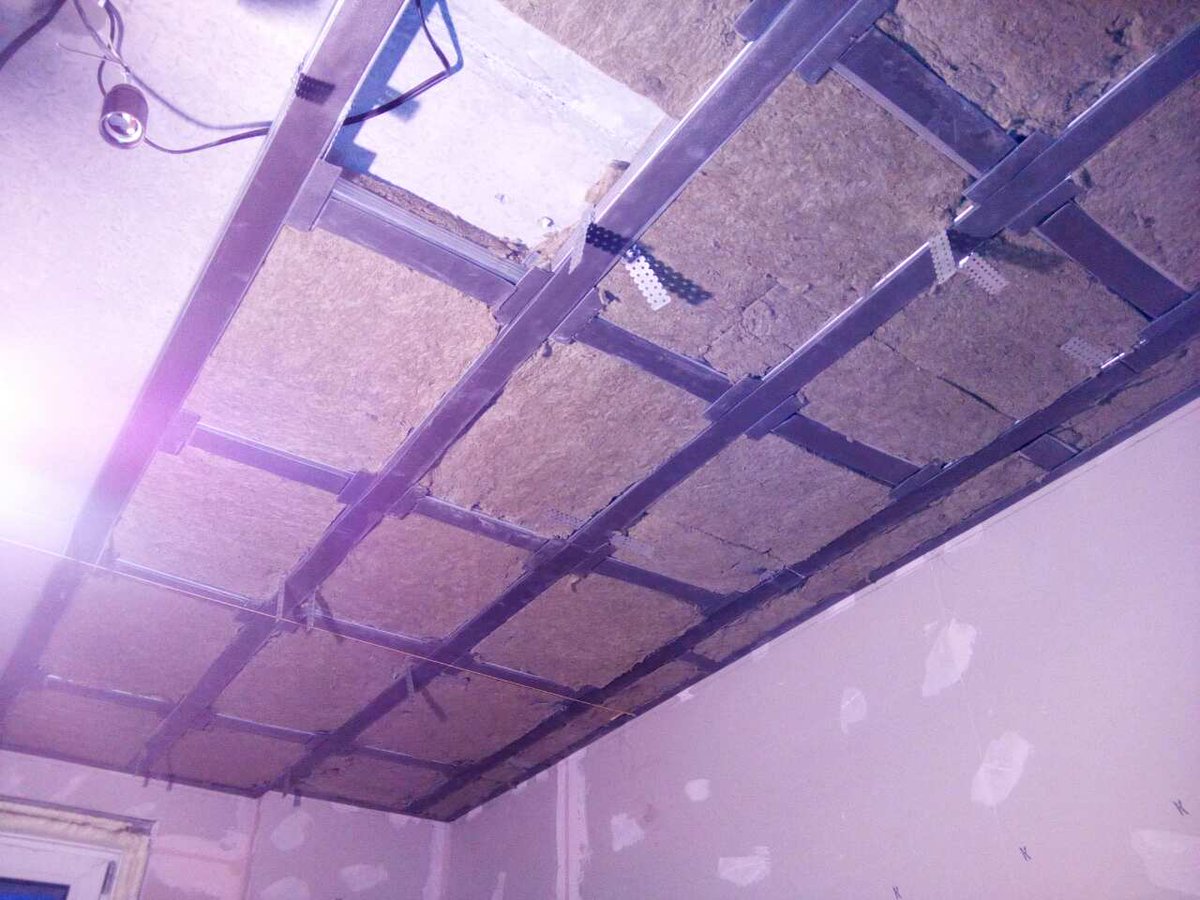2. Устанавливают каркас с соблюдением минимального расстояния между стеной и гиспокартоном. Под профиль, на который будет установлен гипсокартон, прокладывают материал для поглощения шума. Доступный и эффективный материал – стекловата. Если не использовать дополнительных материалов, комната будет защищена от внешнего шума, но внутри помещения любой звук будет превращаться в барабанный стук.