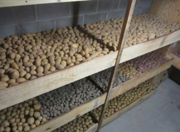 Наиболее приемлемой для хранения овощей считается режим, который находится на нижних показателях плюсовой шкалы, то есть, от +2 до +8 градусов. При этом разные овощные культуры имеют свои предпочтения. Например, картофель лучше хранится при +2+4, поэтому емкости с ним не рекомендуется ставить на пол подвала (рисунок 5). Также следует избегать соприкосновения их со стенами или с другими емкостями.