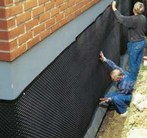 Монтаж гижроизоляции — обязательное условие при утеплении цоколяК выровненному цоколю сетка крепится при помощи клеевого состава, которым фиксируются плиты пеноплекса или тонкого слоя штукатурной смеси. Надежная фиксация не требует вязания узлов. Она осуществляется при укладке полос внахлест. Каждый узел может стать причиной некачественного крепления из-за проникновения воздуха между слоями пирога теплоизоляции.