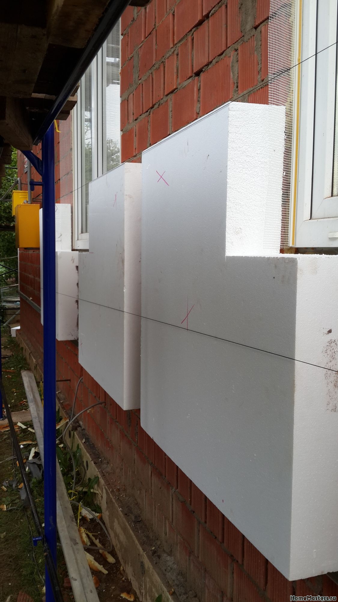 Крепление утеплителя (пенопласта) и нанесение защитного слоя штукатурки.