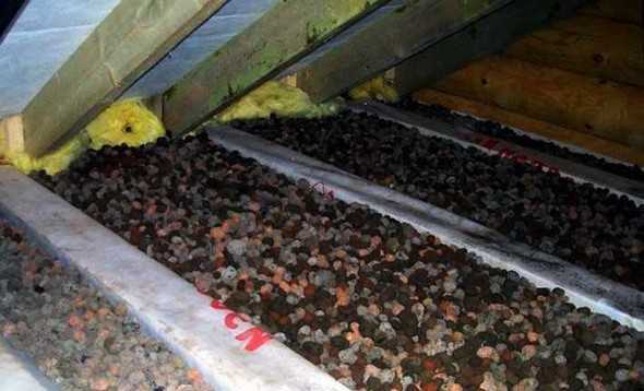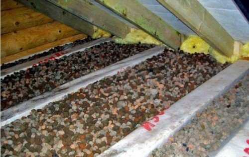- керамзит используется для наружной отделки (со стороны чердака). Он засыпается слоем до 20 см, практически не утяжеляя конструкцию;