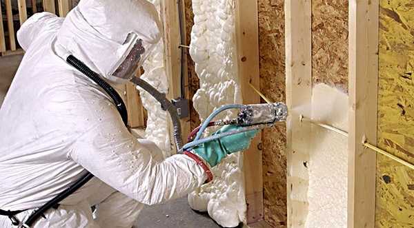 Еще одним материалом для утепления стен является пенополиуретан, который под высоким давлением напыляют на стены, и он застывает, образуя на поверхности пленку, которая не дает проникать влаге. У этого материала прекрасные теплоизоляционные качества, поэтому достаточно всего 5 см напыленного пенополиуретана в том случае, когда пенопласта или минваты потребовалось бы 15 см. Пенополиуретан очень легкий, нагрузка на несущие конструкции от него минимальная, что особенно важно, если предварительно не планировалось утепление наружных стен, и фундаменты не рассчитывались на дополнительную нагрузку.