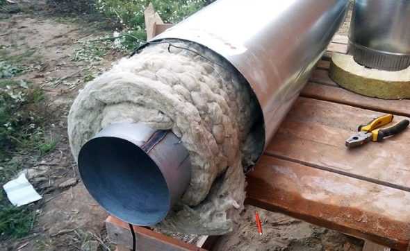 - Непростой монтаж. Процесс утепления достаточно трудоемкий. Первым делом ватой обвертывается труба. Далее, второй слой – фольга или оцинковка. В завершение конструкцию необходимо стянуть бандажом.