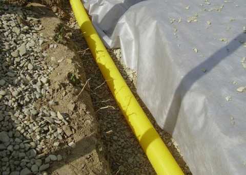 - Остается засыпать трубы щебнем, обмотать их геотканью внахлест и зафиксировать стыки при помощи веревки. Далее геотекстиль засыпается щебнем не достигая верхнего уровня земли примерно на 200 мм. Затем идет слой песка и слой земли или дерна.