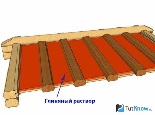По верху потолочных балок выполняется накат из досок, на который укладывается картон с масляной пропиткой, а на него — глина толщиной слоя 30-50 мм. Все щели и зазоры замазываются. После высыхания глины на ней размещается утеплитель — керамзит, мох или дубовые листья.