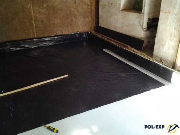 Края уложенного на пол гидроизола заводят на стены