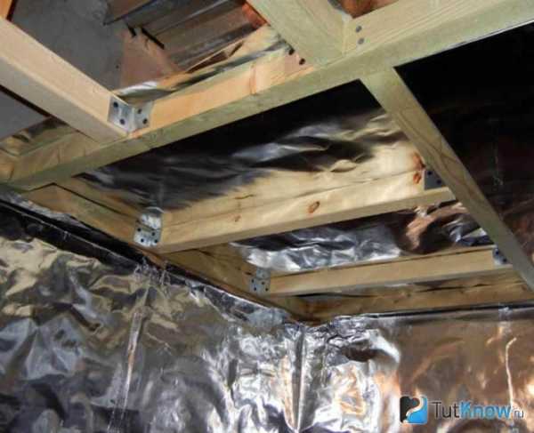 К черновому потолку прибивают брусья, между которыми располагают утеплитель. К брусьям фиксируют фольгированный гидроизоляционный материал металлизированной стороной внутрь помещения.