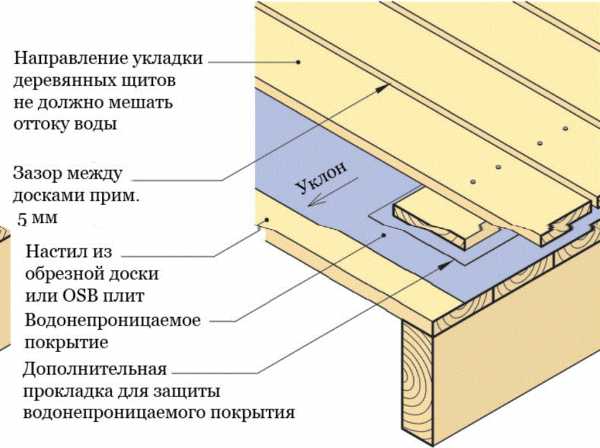 Деревянный пол. Деревянные непротекающие полы служат меньше, так как доски никогда не успевают высохнуть целиком. Лучше делать протекающий пол из хвойных пород, потому что наличие смол в дереве препятствует проникновению воды. В обоих случаях дерево обрабатывают специальными мастиками, повышающими водоустойчивость. Обязательным в системе отвода воды является уклон пола, благодаря которому вода стекает в водоприемник, а оттуда по трубам уходит в канализацию.