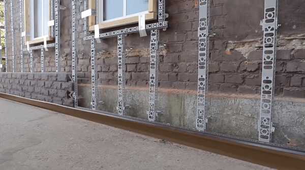 Затем крепится металлическая обрешетка по всей площади покрываемого фасада.