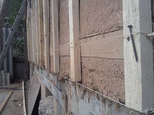 Над цоколем устанавливают отливы. Из брусьев с шагом, на 1 — 2 см меньшим, чем ширина утеплителя, делают горизонтальную обрешетку. Между планками укладывают утеплитель и закрывают его ветрозащитной мембраной.