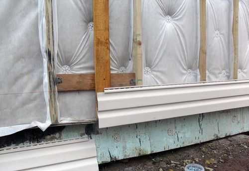 Снимают с фасада все, что может помешать монтажу — наличники, водосточные трубы, светильники, при необходимости — старую облицовку. Стены осматривают, удаляют и ремонтируют поврежденные участки, ремонтируют, выравнивают или меняют окна и двери. Щели в зависимости от вида материалов стен заделывают раствором или герметиком. Деревянные поверхности обрабатывают антисептиком, каменные — грунтуют.