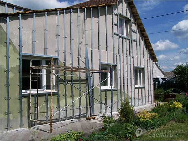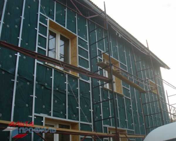 К обрешетке утеплителя с шагом 40 см вертикально крепят профиль, служащий основанием под сайдинг. Кроме того, профиль крепится по периметрам фасадов и проемов. На деревянных стенах обрешетку под сайдинг делают их деревянных планок 60х40 мм, на каменных — из строительного оцинкованного профиля. Наружная поверхность всех профилей должна располагаться в одной плоскости. Их положение контролируется шнурами, натянутыми на разной высоте.