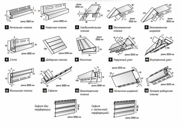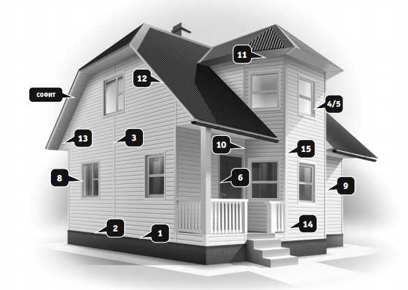 - для расчета длины комплектующих элементов нужно знать, что J-профиль устанавливают в два ряда по периметру свесов крыши (иногда — вокруг проемов), Н-профиль — в местах наращивания панелей в длину, стартовые планки — по периметру цоколя, финишные — возле кровли, оконные — вокруг проемов;