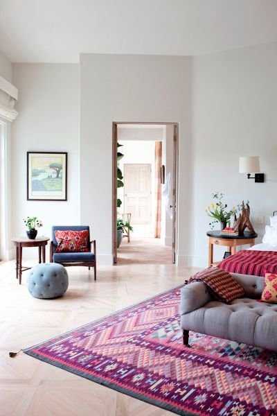 Обустраивать уголок Шахерезады в наши планы не входит. А вот постелить на пол теплый яркий ковер – следует наверняка. Он подарит несколько дополнительных градусов тепла, уют и приятные тактильные ощущения. Лучше всего расположить ковер в местах, где вы часто проводите время – гостиная и спальня в этом просто нуждаются. Разместите на большом ковре диван и пару кресел – место для уютных вечерних посиделок готово. А при грамотном подходе ковер станет смысловым центром комнаты и будет смотреться как красивая фактурная картина.