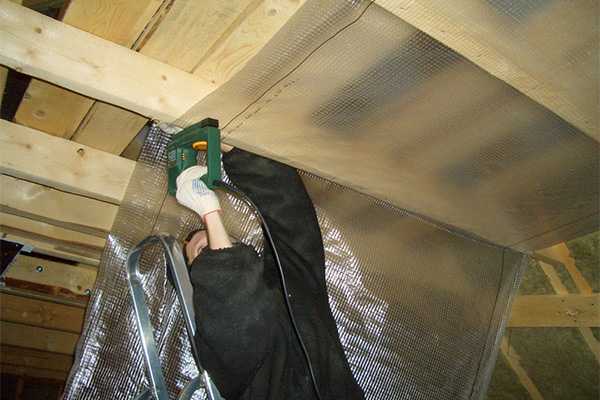 - Для защиты утеплителя от влаги и пыли, сверху него укладывается полиэтилен или термопленка (монтируется с помощью степлера).