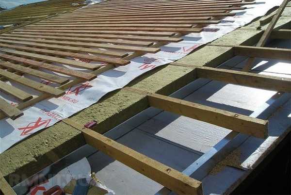 В пространство между стропилами и лагами монтируется рулонный или блочный утеплитель, лучший вариант – минеральная или базальтовая вата. Далее можно укладывать пароизоляционную защиту на потолочную поверхность.