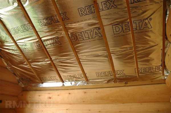 Для теплоизоляции плоской кровли или бетонного потолочного перекрытия изнутри монтируется гидроизоляционная пленка на самоклеющуюся ленту, далее устанавливается обрешетка из дерева или металла.