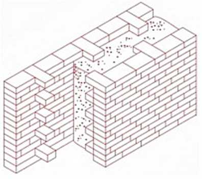 Также известна технология заполнения керамзитобетоном крупнопористым пространства между двумя кладками в полкирпича, которые выступают в роли несъемной опалубки. В них в каждом 2 – 3 ряду устанавливаются тычковые кирпичи, выступающие в роли анкеров.