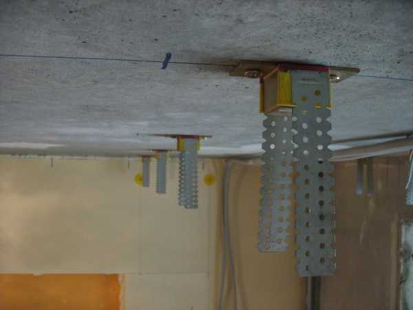 - На расстоянии 60 см. друг от друга закрепляются металлические подвесы, куда монтируется профиль для гипсокартона.