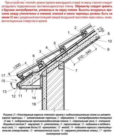 Существует вариант исполнения совмещённой (мансардной) кровли, при котором в качестве подкровельной плёнки используется паронепроницаемая гидро или пароизоляция. Но в этом случае необходимо обеспечить эффективную вентиляцию пространства как над плёнкой, так и под ней, суммарная высота вентзазоров достигнет 10 см. Такое решение эффективно, но усложняет конструкцию и применяется нечасто. Обратите внимание, что подкровельная плёнка (4) ближе к свесу выведена поверх стального фартука (15), а тот — в желоб водосточной системы. Так нужно делать всегда, это обеспечить стекание конденсата за пределы конструкции кровли