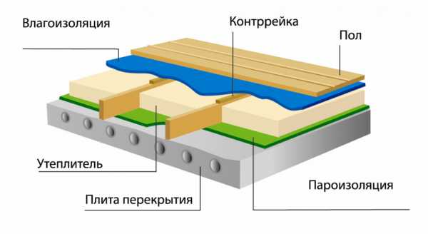 При монтаже пола необходимо защищать помещения от влажных испарений, которые поднимаются из грунта. В этом случае приходится иметь дело с влагой в парообразном состоянии, поэтому утеплитель пола укладывают поверх пароизоляционной плёнки, а сверху такой материал, как эковата, можно дополнительно защитить лёгкой ветрозащитой, чтобы для очистки пола можно было использовать влажную уборку или пылесос.