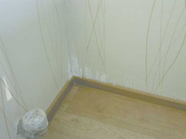 Вид промерзавшего ранее угла квартиры через несколько лет после окончания работ (угол закрыт кухонным гарнитуром, задняя стенка которого видна слева; перед установкой кухонного гарнитура пришлось сдвинуть ближе к раковине запорную арматуру и счетчики горячей и холодной воды для сохранения доступа к ним).