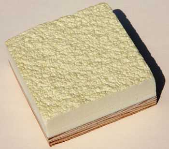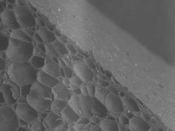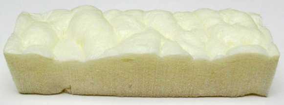 Рис. Образец эластичного пенополиуретана Открытоячеистый ППУ, как мы понимаем из названия, представляет собой материал из открытых взаимосвязанных, так сказать, «взломанных» пузырьков, наполненных воздухом, что делает его легким, «дышащим» и эластичным. Пенополиуретан с открытыми ячейками имеет ярко выраженные эластичные свойства, отлично и быстро вспенивается, увеличиваясь в объеме до 100 раз. Плотность открытоячеистых ППУ колеблется в пределах 8-20 кг/м3.