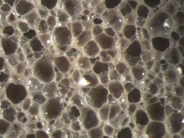 Рис. Образец жесткого пенополиуретана Закрытоячеистый ППУ представляет собой жесткую и прочную губку с миллионами закрытых, изолированных друг от друга ячеек-пузырьков, наполненных газом, образовавшимся в результате взаимодействия компонентов ППУ, приводящая к подъему и расширению пены в объеме до 30 раз по сравнению с жидкой композицией и последующей полимеризацией. Этот газ имеет более низкую теплопроводность, чем воздух. И именно то, что более 92% материала составляет тот самый газ (и всего менее 8% – твердое вещество), делает его лидером среди всех ныне существующих теплоизоляционных материалов. Коэффициент теплопроводности ППУ с закрытыми ячейками не превышает величины 0,019-0,03 Вт/(м*К).