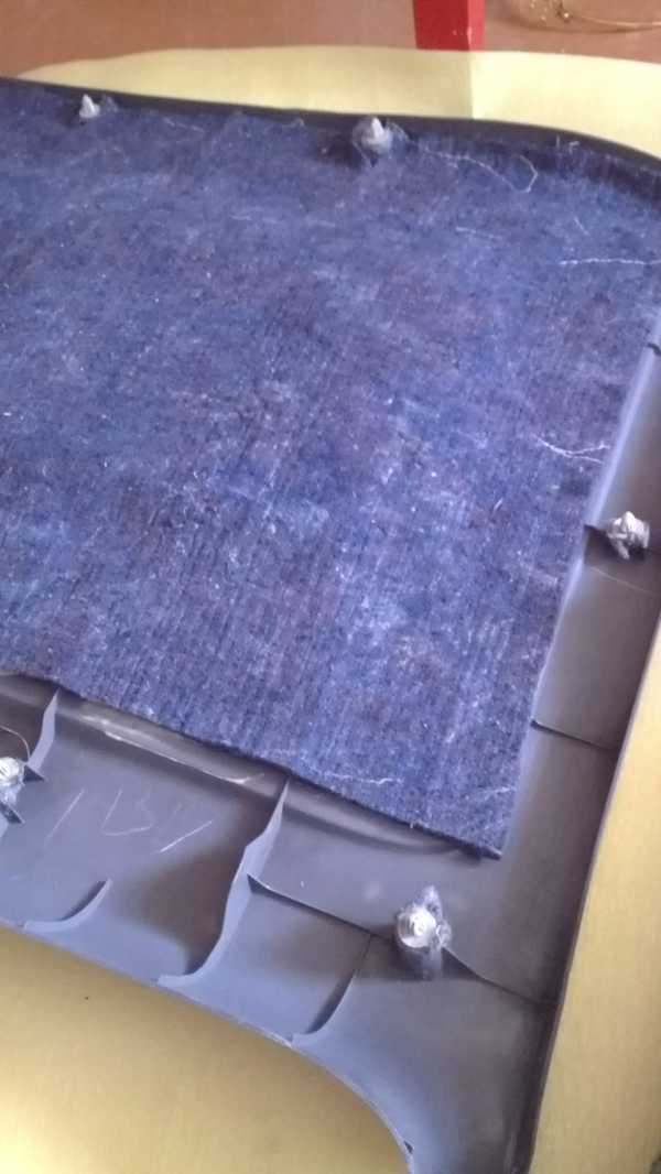 После заклейки виброй техотверстий, залепил все большим куском Сплэна, четверкой. Ну, так, для теплоизоляции, на всяк случай. А саму обшивку проклеивал войлоком (фотки ниже) на клей Момент (вонючий, зараза). При этом места, где к обшивке крепится клипса крепления, делал прокладку из войлока, чтобы не тарахтели (болтались жутко). Фото ниже: