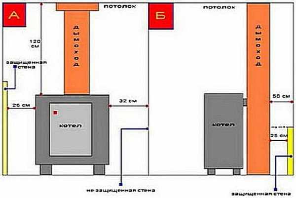 Существующие правила расположения котла предусматривают следующие расстояния до стен и потолка.