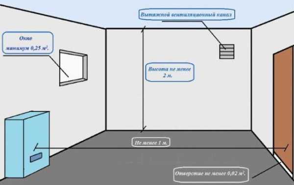 - Объем помещения должен быть не менее 15 кубометров, плюс 1 кубометр на каждый киловатт мощности газового котла.