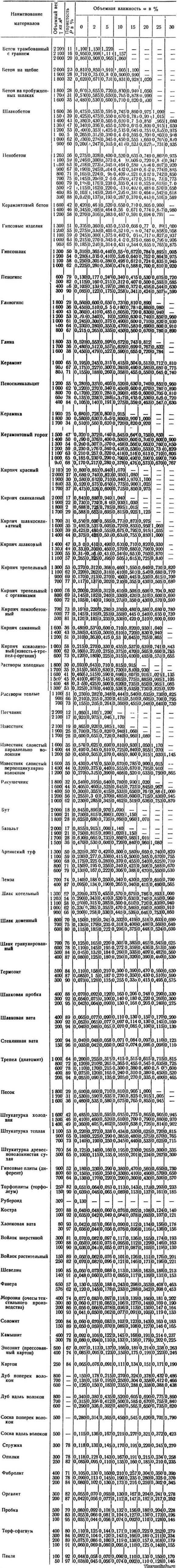 Приведены значения теплопроводности следующих материалов: бетон, шлакобетон, пенобетон, гипсовые изделия, гипсошлак, пеногипс, глина, керамзит, пеносиликальцит, керамика, керамзитовый горох, кирпич красный, трепельный, силикатный кирпич, шлакосиликатный, шлаковый, кирпич пемзобетонный, саманный, ксилолитовый, растворы холодные, теплые, песчанник, извесняк, ракушечник, бут, базальт, артикский туф, пемза, шлак, термозит, шлаковая пробка, вата, стеклянная, хлопковая вата, трепел (диатомит), песок, штукатурка холодная, теплая, гипсовые плиты (диферент), торфоплиты (торфолеум), рубероид, костра, войлок шерстяной, растительный, шевелин, морозин (очесы текстильного производства), соломит, энсонит (прессованный картон), картон, дуб, сосна, стружка, опилки, фибролит, оргалит, пробка, торф — сфагнум, пакля.