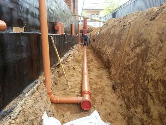 В зависимости от глубины залегания грунтовых вод и типа почвы, может потребоваться обустройство дренажной системы, служащей для сбора и отвода атмосферных и грунтовых вод в колодец. Такая необходимость в основном возникает при плохой проницаемости грунта и высоких грунтовых водах. Для постройки дренажной системы нужно выкопать траншеи по периметру здания на расстоянии около 70 см от него. Глубина зависит от уровня грунтовых вод. Ширина — 40 см. Траншея должна располагаться с некоторым уклоном по отношению к яме и колодцу.