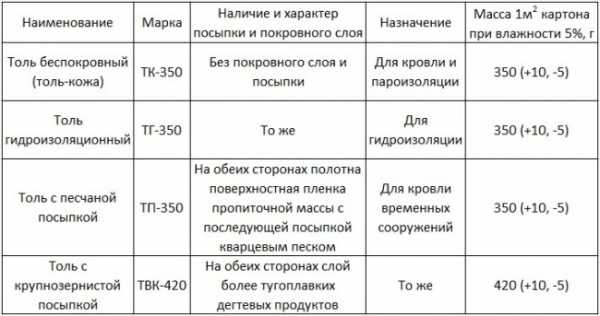 Толь гидроизоляционный – ТГ-350: толь без слоя посыпки, используется для гидроизоляции, масса одного квадратного метра картона при влажности 5% — 350 г (+10, -5).