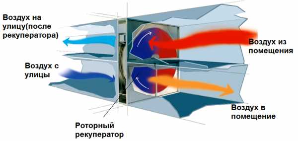 Рекуператоры роторного типа являются самыми эффективными. Их конструкция проектируются таким образом, что входящий и исходящий потоки воздуха, не смешиваясь между собой, обеспечивает вращение специализированного механизма.