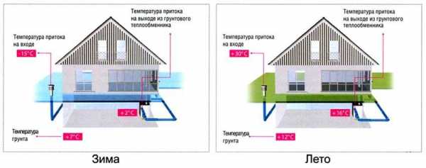 Прибор работает при помощи теплообменникаВ подобных системах нагрев «зима-лето» осуществляется при помощи грунтового теплообменника.