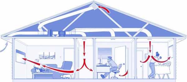 В системе вентиляции также устанавливаются фильтры для очистки воздухаВо внутренней вентиляционной системе дома подводится два воздуховода, которые обеспечивают скопление загрязненных воздушных масс под крышей дома и их дальнейшее удаление в атмосферу.