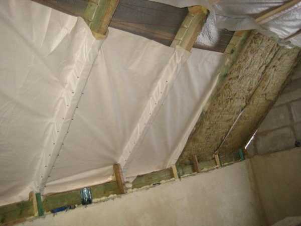 Пароизоляция крепится гладкой стороной к утеплителю, ворсистой наружу. Она укрепляется рейками с расстоянием 40 см между ними.