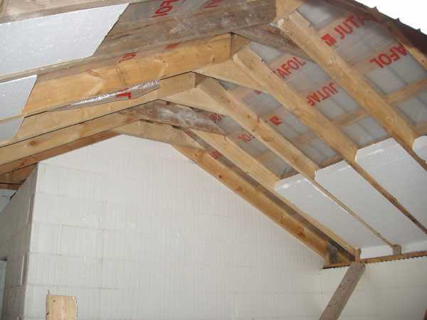 Еще один момент — толщина стропил и плит изолятора (к примеру, пенополистирола) может быть разной. Если плиты «тоньше», то первый слой укладывают между стропилами, а второй – на стропила. В случае, когда плиты толще, на стропила следует набить деревянные рейки, исключив такой «перепад» по высоте. На качестве работы это не отразится.