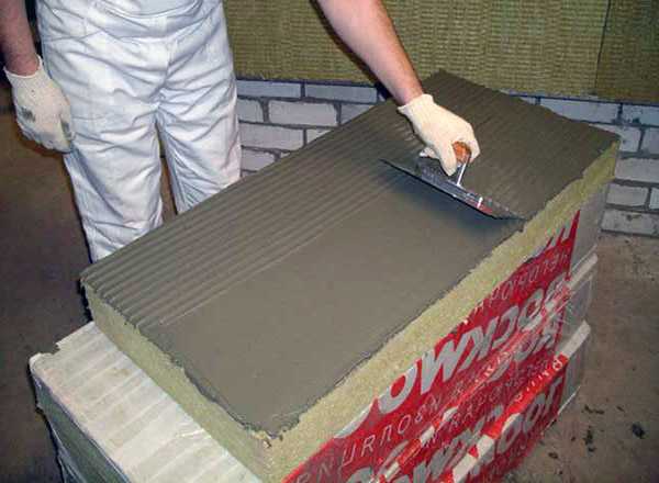 В зависимости от состояния изолируемых поверхностей, а также от типа утеплителя клеевую смесь на поверхность плит наносят маяками, полосами или сплошным слоем.