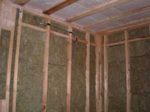- Набиваем деревянные бруски, между которыми плотно укладываем минеральную вату;