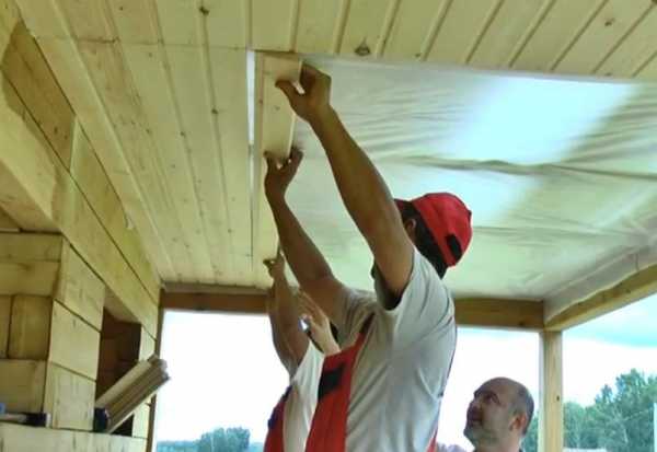 Для начала крепим гидробарьер и обшиваем наш потолок брусом 27х27 мм. Помните, что необходимо стараться укладывать брус так, чтобы зазоры не превышали восьми миллиметров. И еще запомните: гидробарьер крепим горизонтально, а брусья – вертикально. На следующей стадии вставляем пеноплекс между брусками и укладываем теплоотражатель. После этого на потолок крепится блокхаус (также можно использовать вагонку и др. материалы). Крепить блокхаус нужно исключительно концентрическими рядами.